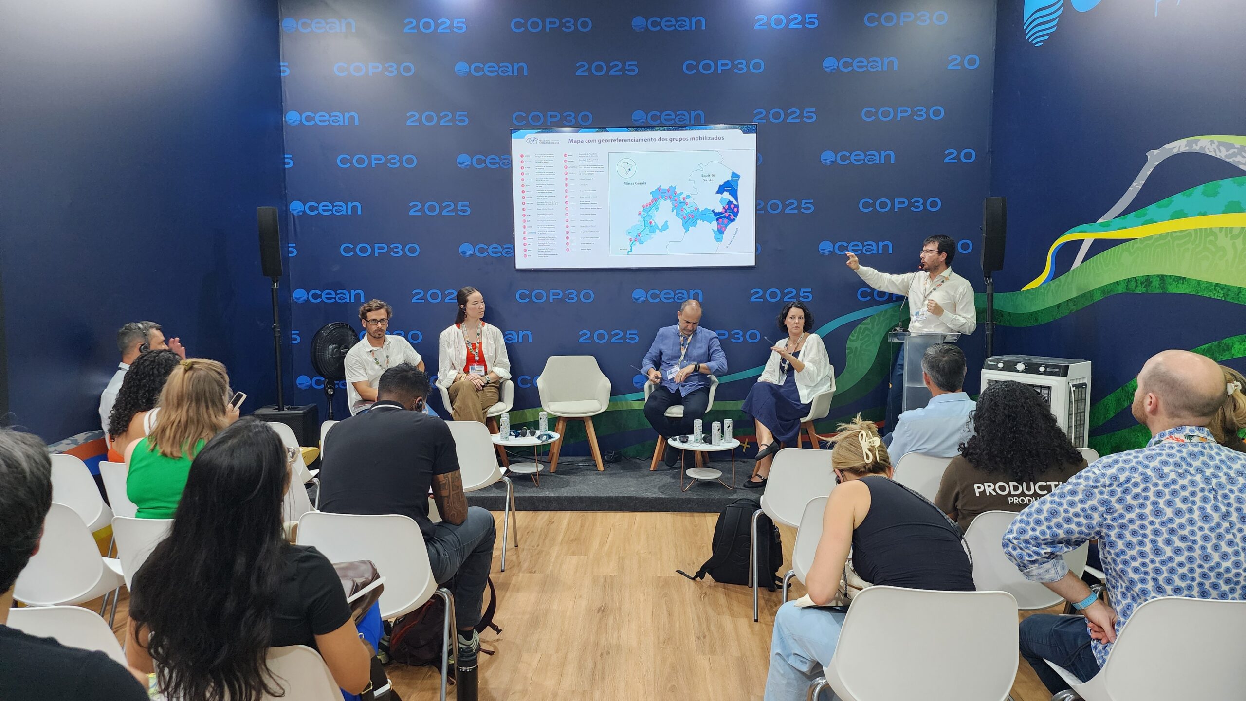 Em oportunidade para falar sobre a resiliência na pesca e na aquicultura, foi destacado o papel do Pescando Oportunidades como um projeto que busca promover a recuperação social e econômica dos pescadores e aquicultores no território impactado pelo rompimento da Barragem de Mariana. O projeto atua em territórios de Minas Gerais e Espírito Santo, com atividades que apoiam a comunidade a se reinserir no mercado pesqueiro — e recuperar, de forma saudável, a cultura da pesca passada de geração em geração.